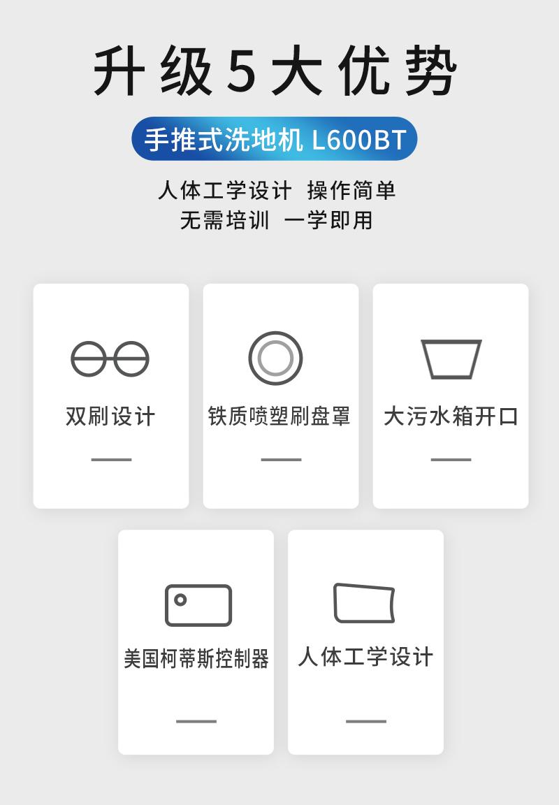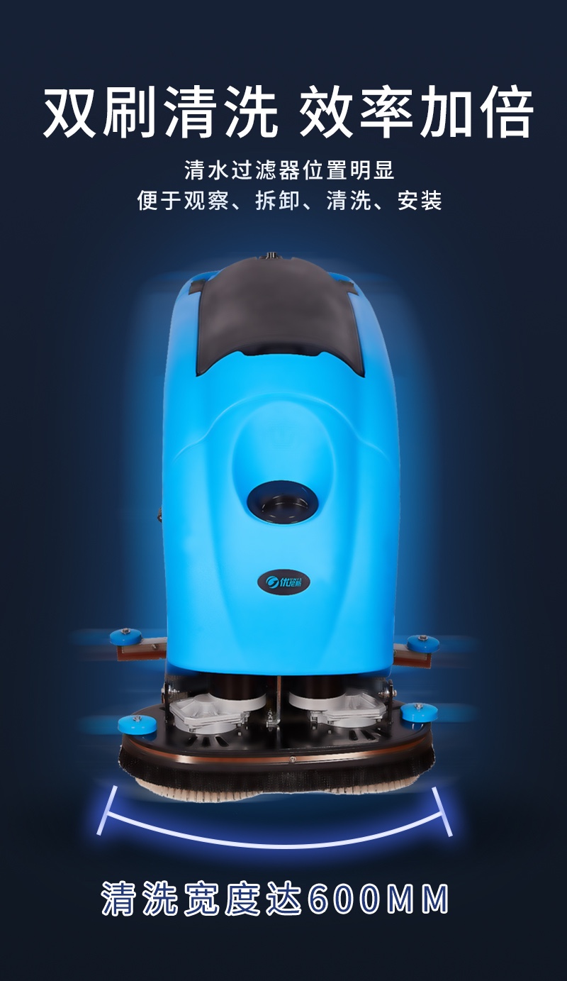 * 手推双刷,效率加倍 * 行走助力,轻松省力 * 大污水箱开口,维护简单方便